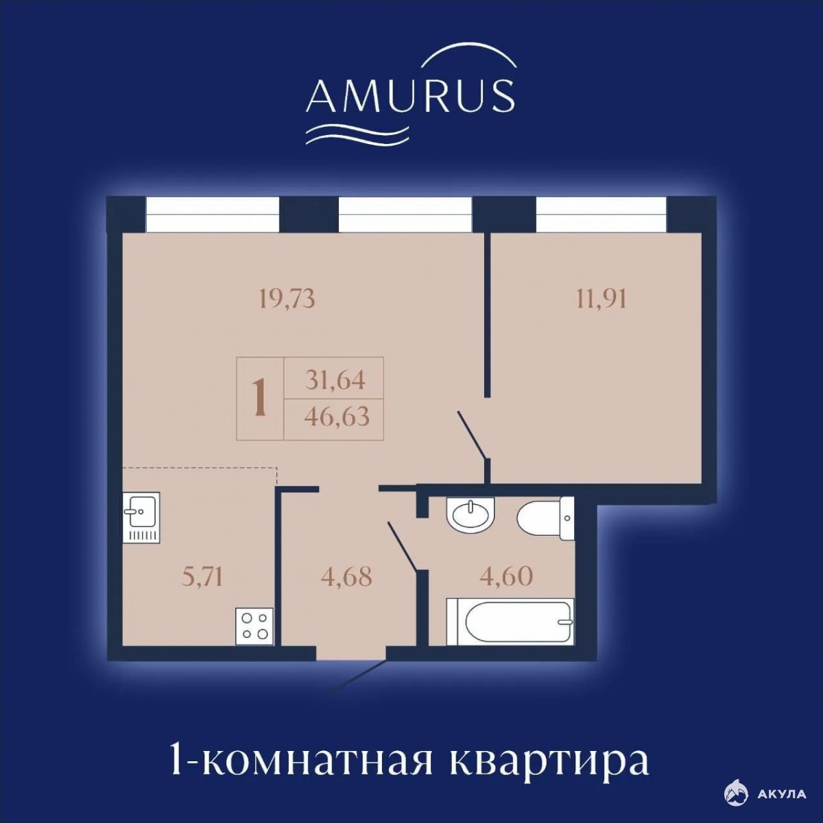 Общая площадь квартиры 46, 63 кв.м. Одна из самых удачных планировок проекта. Торцевая, расположена в правой части дома, имеет шикарные видовые характеристики: наслаждайтесь закатами, любуйтесь Амуром, огнями города и набережной. Высота потолков 3, 1 метра, окна размером 2 на 2, 10 метров.