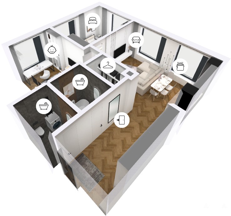 Общая площадь квартиры 69, 18 кв.м. Одна из самых удачных планировок проекта. Торцевая, расположена в правой части дома, имеет шикарные видовые характеристики: наслаждайтесь закатами, любуйтесь Амуром, огнями города и набережной. Высота потолков 3, 1 метра, окна размером 2 на 2, 10 метров.