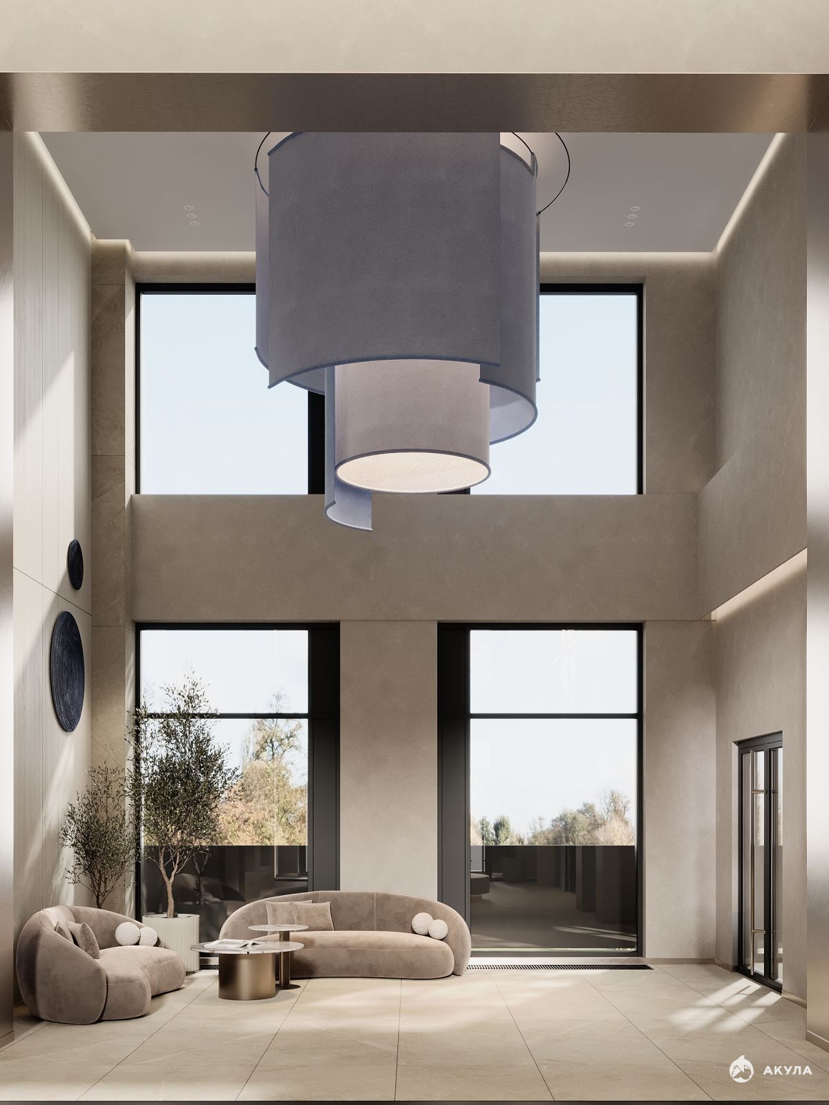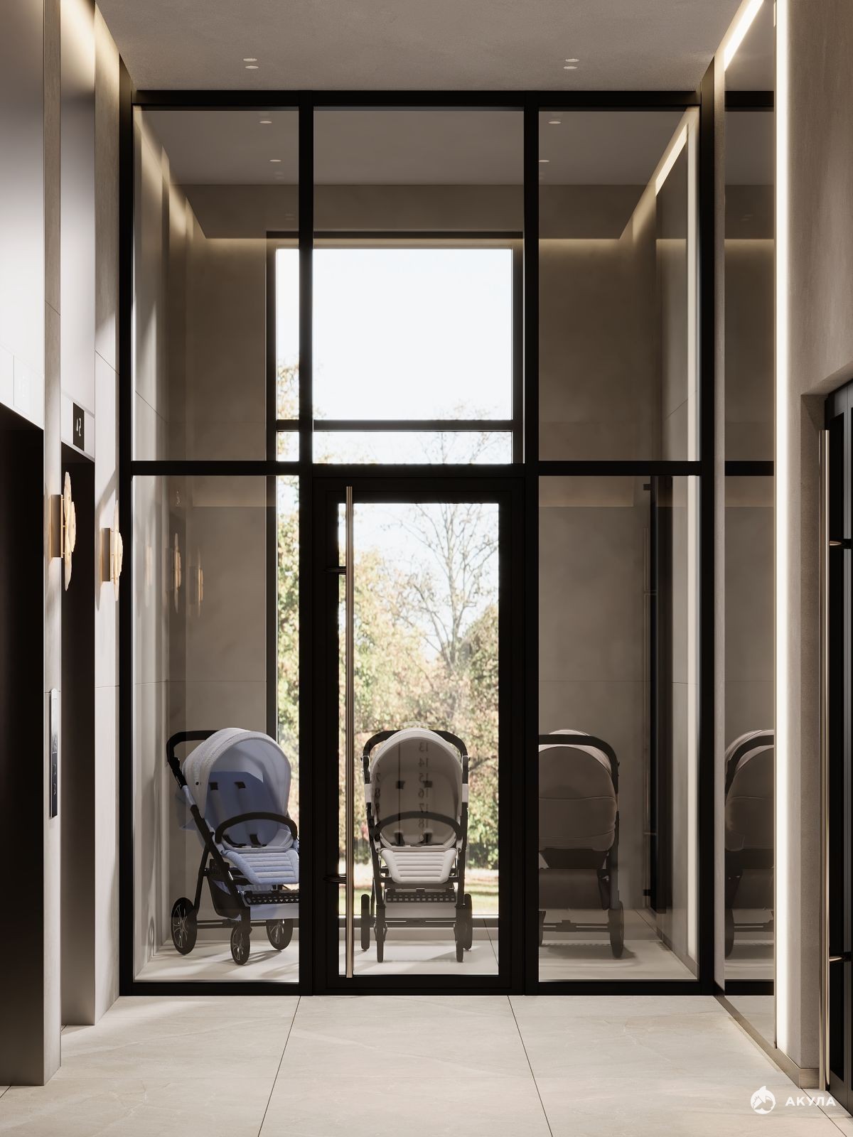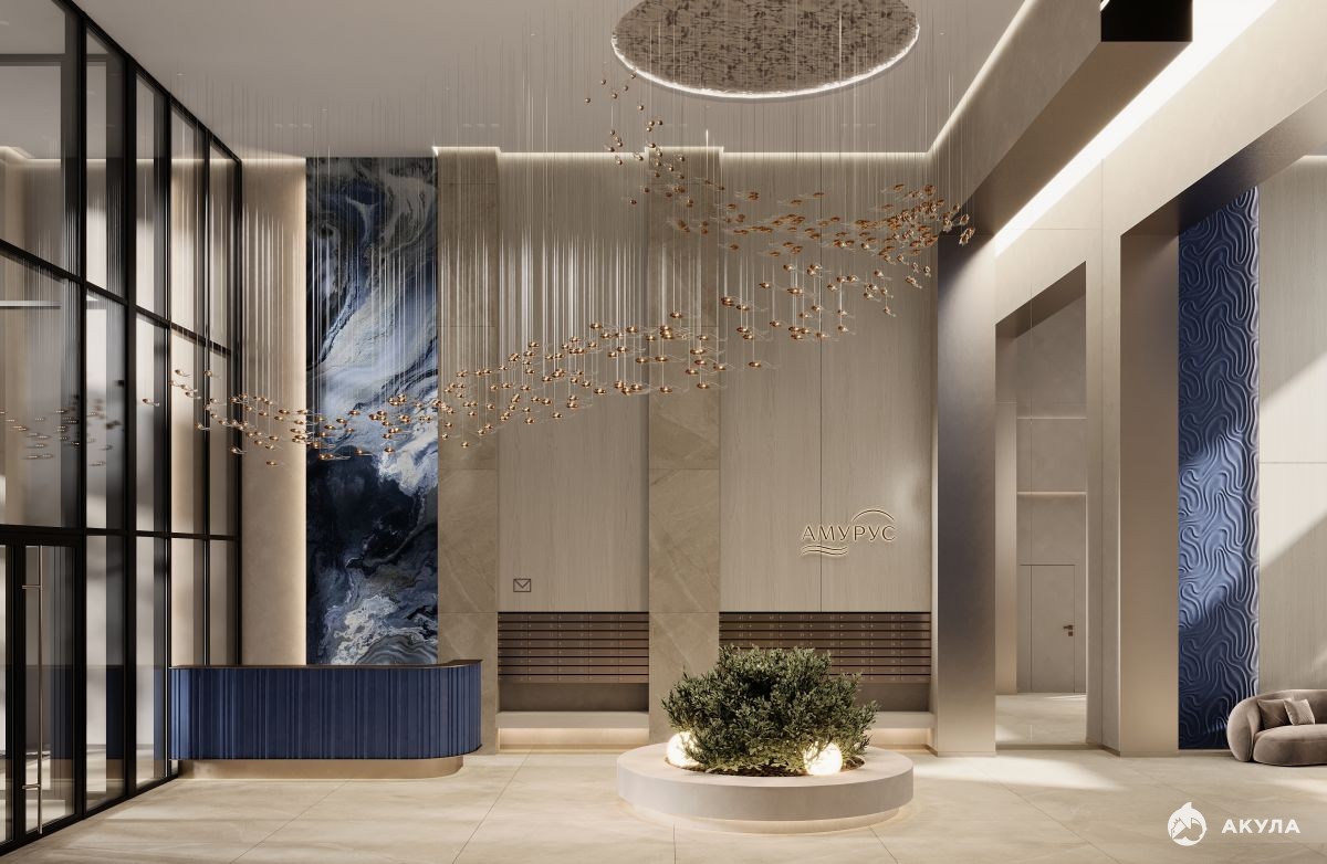 Входная группа в дом выполнена витражным остеклением из теплых алюминиевых профилей Шуко с заполнением двухкамерным стеклопакетом. Вы заходите в дизайнерский холл с высотой потолков 7 метров, где вас встречает консьерж. Здесь есть зона ожидания, гостевой санузел. Через холл можно попасть на закрытую дворовую территорию или пройти к лифтам. На скоростном лифте можно подняться на свой этаж, подземный паркинг или в лаундж зону для жителей ЖК - эксплуатируемую террасу на крыше, на которой можно любоваться видом на город, реку Амур и небо с высоты 70 метров.